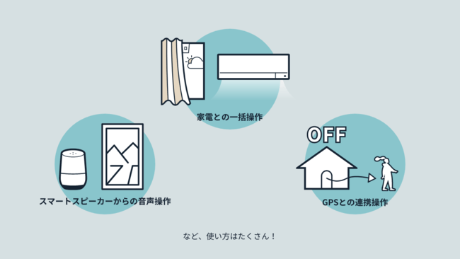 スマートスピーカーと連携させると、声で家電を操作することも可能です。また、時刻、アプリのGPS機能、搭載された環境センサー(温度・湿度、照度、人感)を利用し、オートメーションを設定することで家電を自動で操作することが可能です。