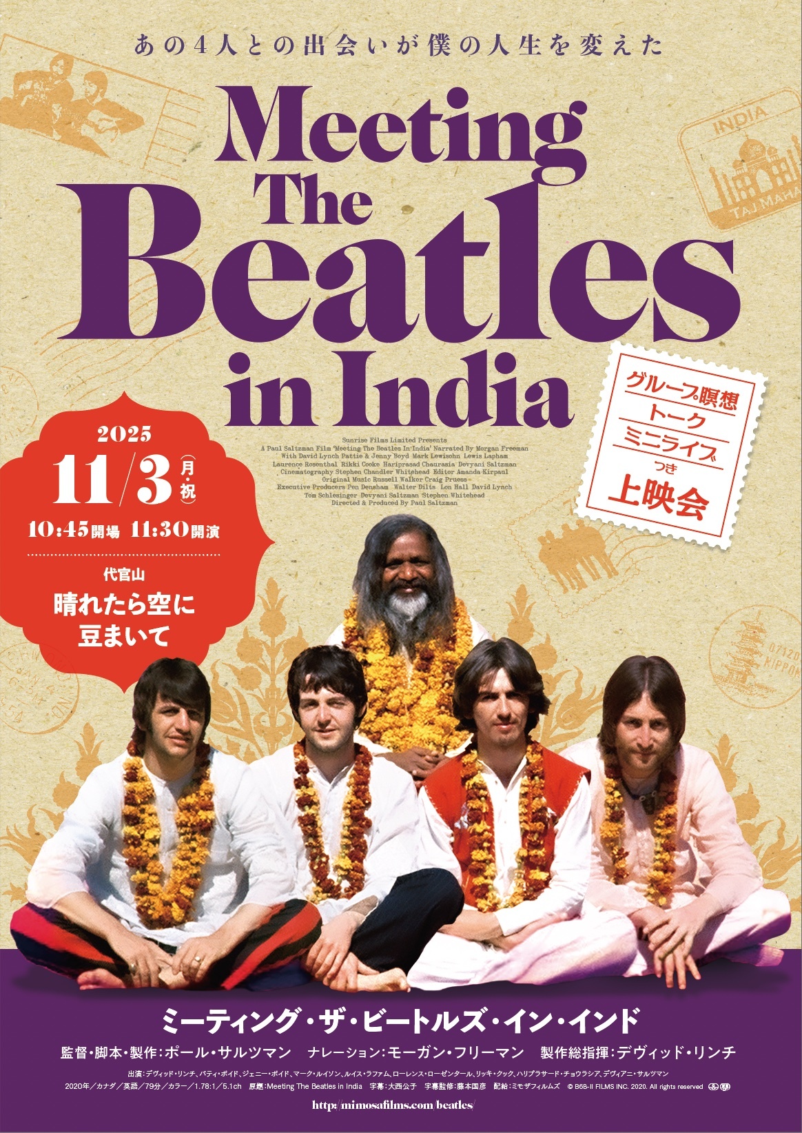 一般社団法人マハリシ総合教育研究所(本部:東京都千代田区麹町 代表:鈴木 志津夫)は、映画『ミーティング・ザ・ビートルズ・イン・インド』の上映会(グループ瞑想+トーク+ミニライブつき)を、2025年11月3日(月・祝)東京・代官山のライブハウス「晴れたら空に豆まいて」で開催いたします。