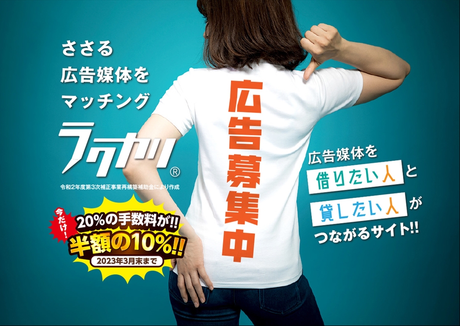 総合広告代理業、デザイン制作を展開する株式会社 宣伝館(本社:大阪府東大阪市、代表取締役:岡田 哲也)は、広告媒体のマッチングサイト「ラクカリ」を2月20日(月)にリリースします。貸主=「広告媒体を貸したい方」は身の回りのどのようなスペースでも広告媒体として借主=「広告を出したい方」を募集することができ、「スペース」を有効活用することで副収入に繋がります。一方、借主は自分にぴったりの宣伝方法を検索、安価でピンポイントな広告の出稿が可能となります。システムの利用手数料は取引が成立した場合のみ発生する成果報酬型で、3月31日(金)まで半額となるキャンペーンを実施します。
