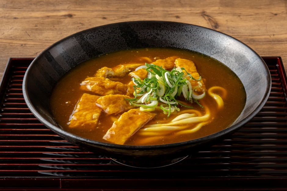京都では「きつねうどん」といえば京あげが入ったきざみうどんの事で、このカレーうどんも京あげを京都から仕入れ、その京あげをいっぱい、出汁とスパイスの利いたカレーうどん餡の中に入れた、京のカレーうどんの定番と言える一品。