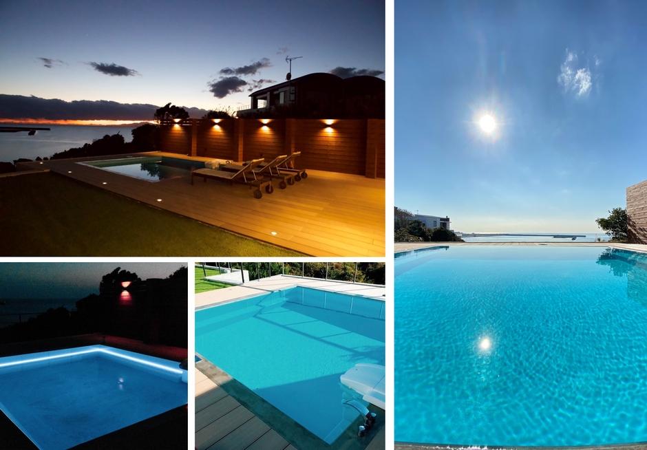 冬でも海を一望できる巨大露天風呂が楽しめる! 夜にはライトアップもし、幻想的なプライベート空間を演出します。