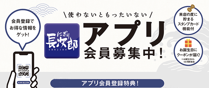 にぎり長次郎をお得にご利用できる、公式アプリを配信しています。