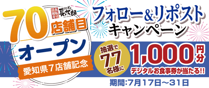 70店舗オープン(愛知県では7店舗目)記念として2024年7月31日(水)まで、「デジタルお食事券1,000円分」が77名様に当たる、お得なXキャンペーンを開催します。にぎり長次郎のX公式アカウントをフォローし、キャンペーンポストをリポストすることでご応募いただけます。本お食事券はにぎり長次郎各店舗で1,000円以上のお食事をしていただく際にご利用いただけます。