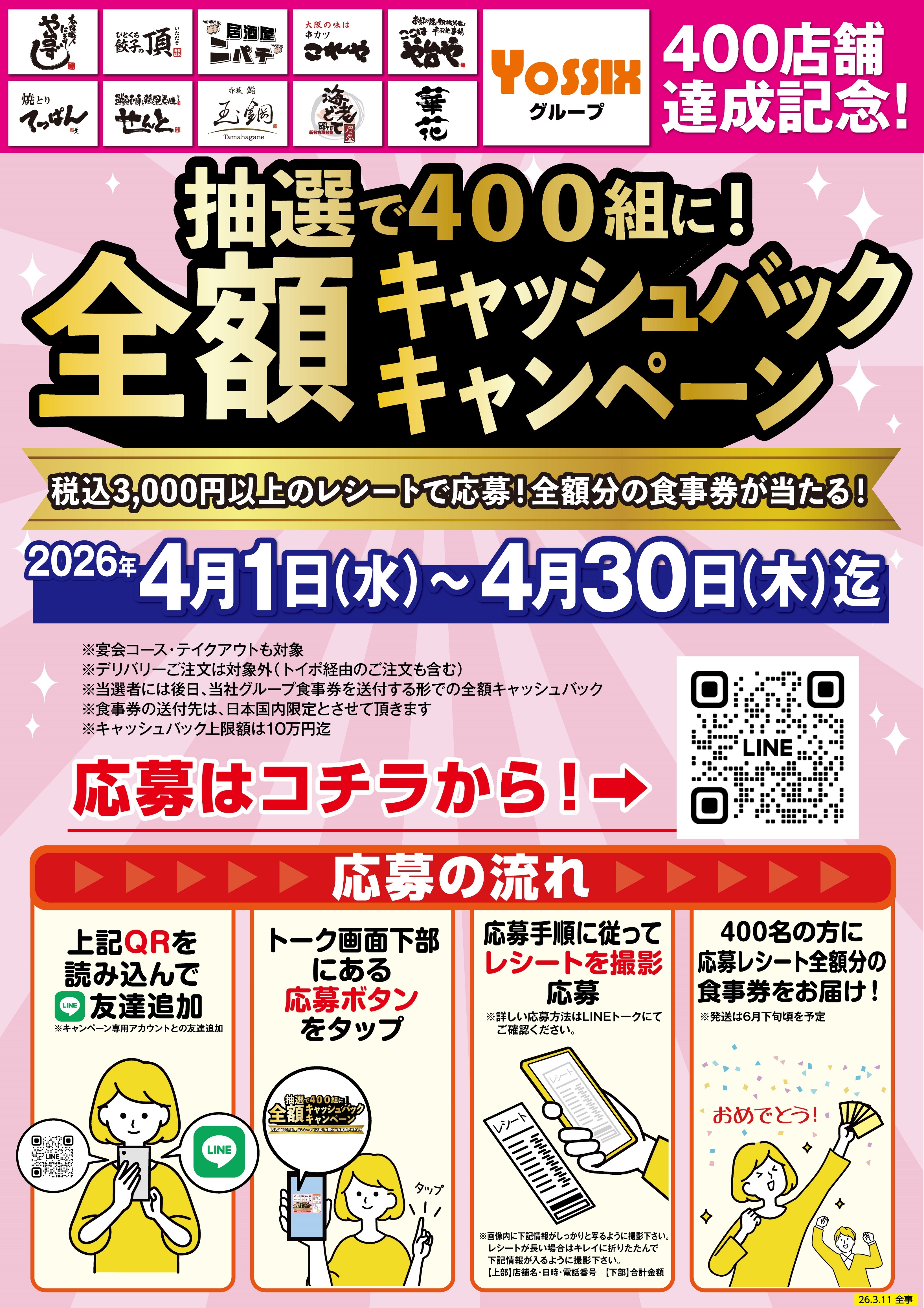 ヨシックスグループ【400店舗達成記念】 抽選で、何と飲食代金の全額をキャッシュバック!!