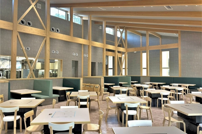 新たにオープンするレストランは、牧場の広大な自然を一望できる開放的な空間で、訪れるすべての方に特別な食体験を提供します。テラス席やパラソル席等約400席を備え、従来の8人掛け1テーブルを、4人掛け席仕様に変え、よりリラックスしたカジュアルな雰囲気をご提供するとともに、テラス席も従来より1.5倍に増やし、自然の景観を楽しみながらお食事をお楽しみいただけます。ペット同伴でお食事いただけるパラソル席もございますまた随所に環境に配慮した取り組みや、千本松牧場ならではのアイデンティティを盛り込んだモニュメント・壁材・スポット等も登場します。