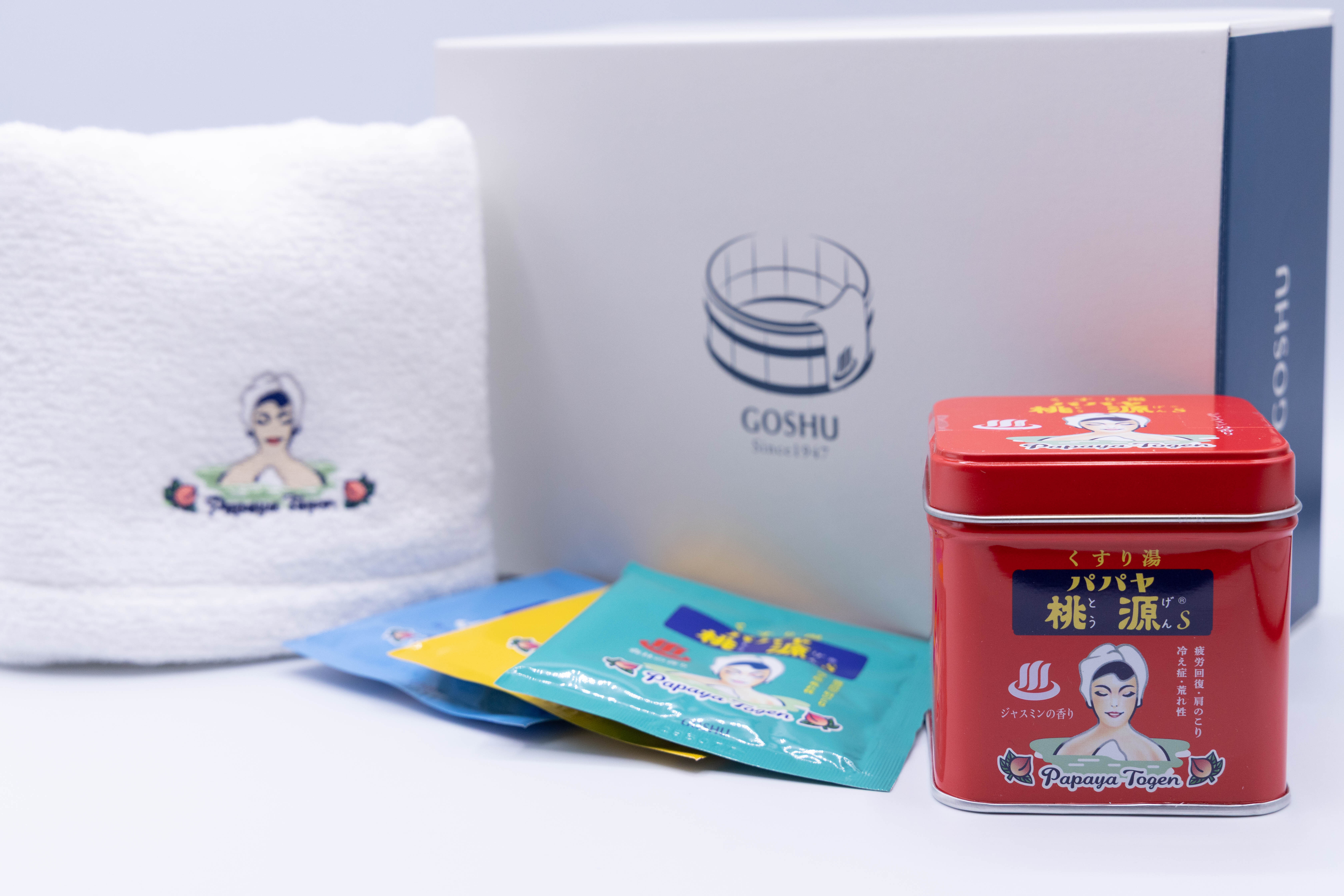 その相性を大切にした、初の【お肌想いのセット】が誕生しました。今、人気の昭和レトロ感漂うノスタルジックな世界感をご堪能ください。浅野撚糸の世界初の特許技術「スーパーZERO(R)」で作り上げた肌に優しいパパヤ桃源刺繍入りタオルと長年愛され続け半世紀以上のパパイヤ酵素入り入浴剤・石鹸オリジナル缶との夢のコラボBOX!