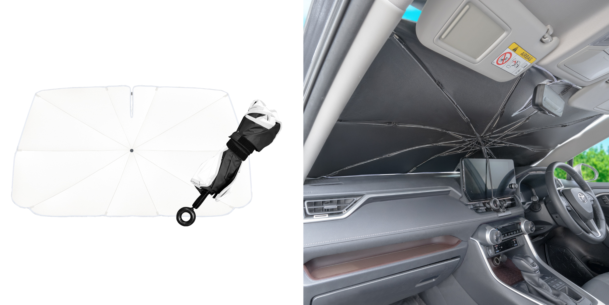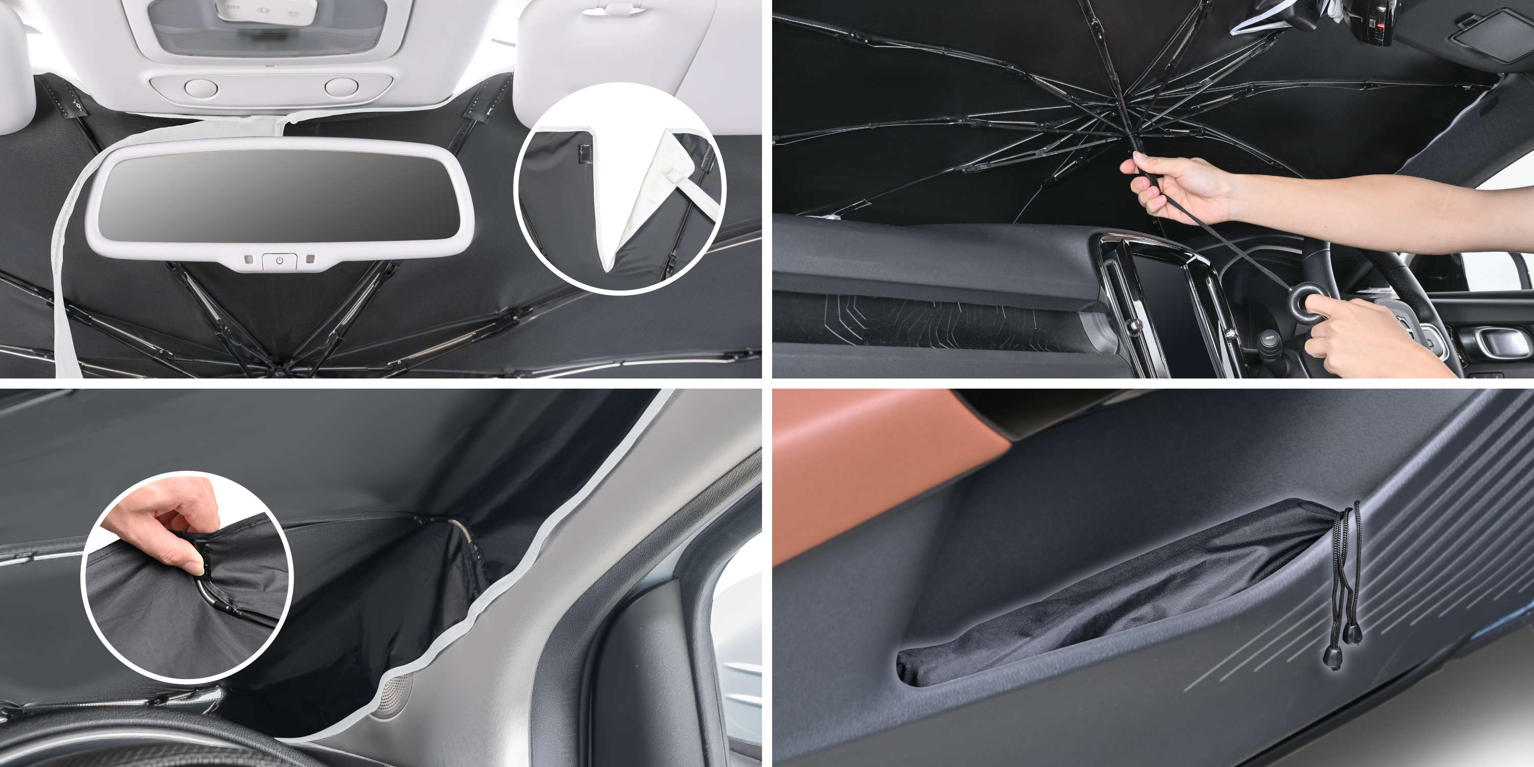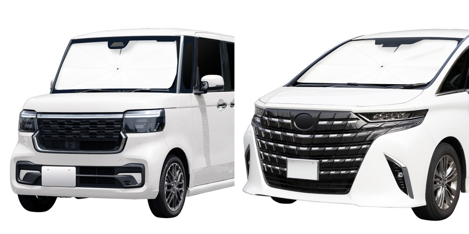 ワンタッチで開く傘型タイプ3サイズと、サッと広がるポップアップタイプ4サイズの2タイプを展開。骨組みのリニューアルにより、従来よりも幅広い車種に対応できるようになりました。
