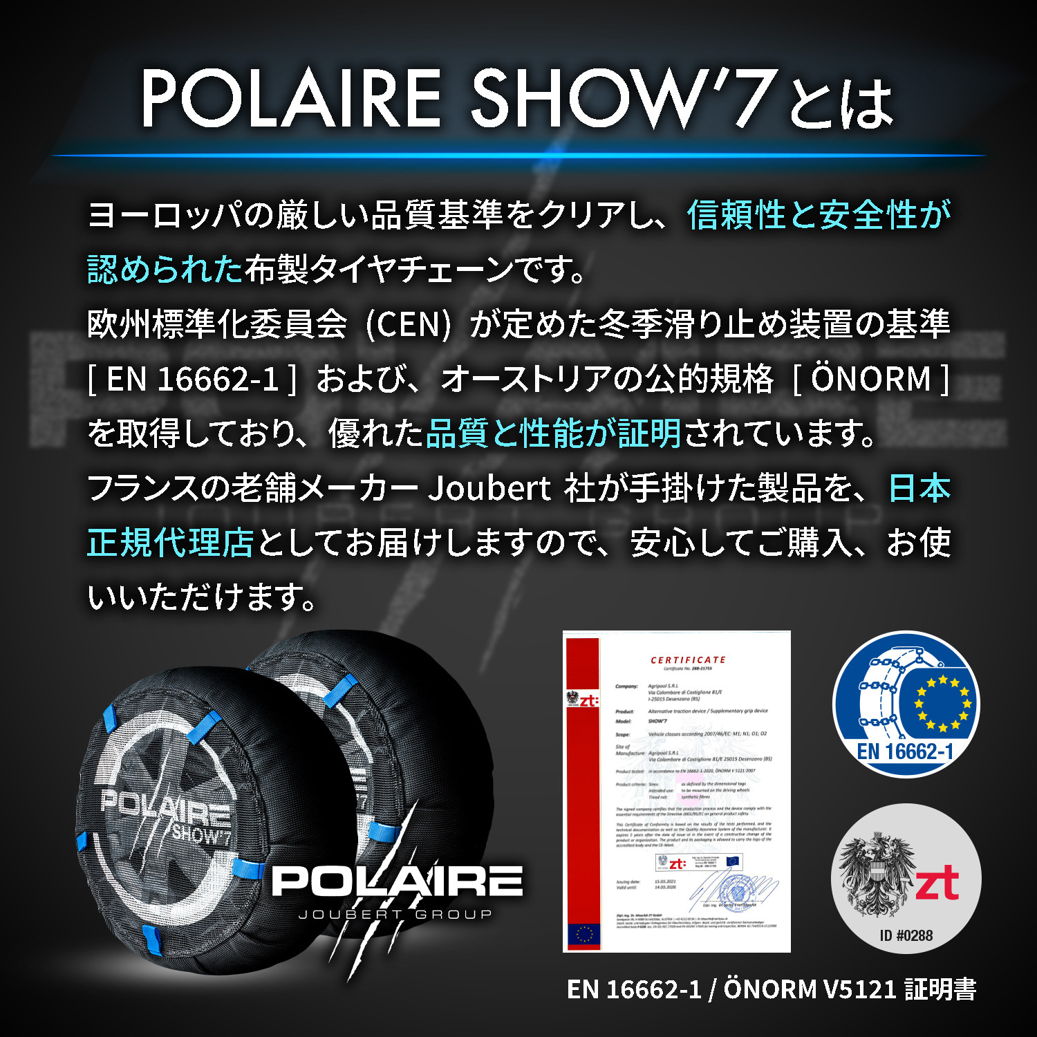 ショーセブンは、革新的なデザインと高性能素材で、雪や氷の上での安心・快適なドライブを提供します。その独自の構造により、耐久性と使いやすさを両立しています。