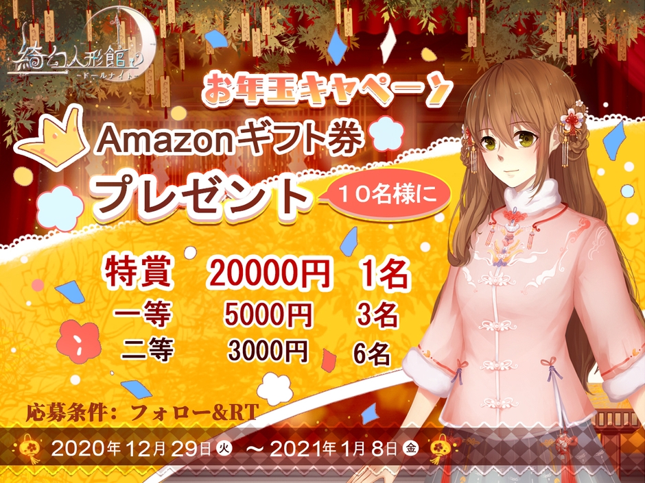 更に、公式ツイッター( @dollnight_jp )で「最大2万円分Amazonギフト券が当たるお年玉キャンペーン」も開催しています。是非ご確認ください!