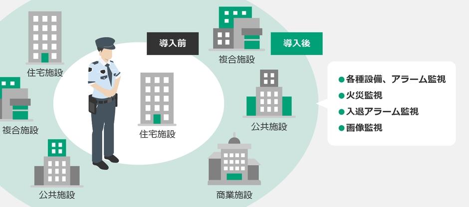 ※1 エリアマネジメントセキュリティは、隣接する複数の警備対象施設を統合。これまでの「各拠点(ビル)の警備」から「エリア(まち)の警備」を実現する新しい警備の考え方です。