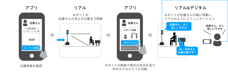 話しかけたい相手の位置をアプリで確認すると、自走式ロボットが席の近くへ自動で移動。アプリに表示される映像で相手の状況を見た上で、声をかけるかどうか判断できます。話しかける際はロボットが相手の隣へ移動するので、お互いに顔を見ながらコミュニケーションをとることも可能です。5Gの“低遅延”という特性によって、よりスムーズな会話が実現できます。