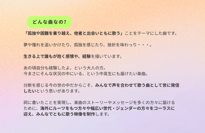 「あの頃の自分がつらい状況の中でも未来に希望を見出そうとしたように、今の日本で生きづらさや困難さを抱えている人たちにも、この楽曲を通じて希望を感じてもらえたらと願っています」