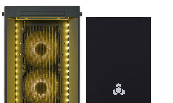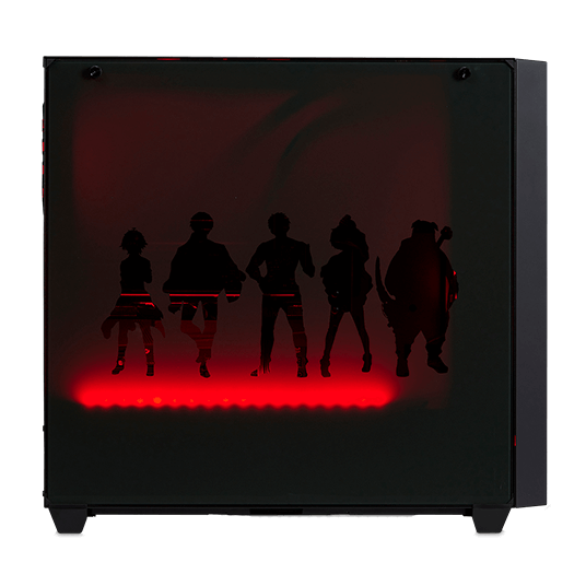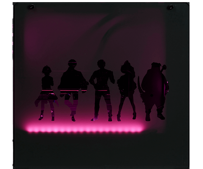 前面の水冷システム内側に最大3基、天面と背面に3基、最大6基のLEDファンを搭載。上質なLEDライティングとドズル社メンバー5人のシルエットが楽しめる左側面のオリジナルガラスパネル。