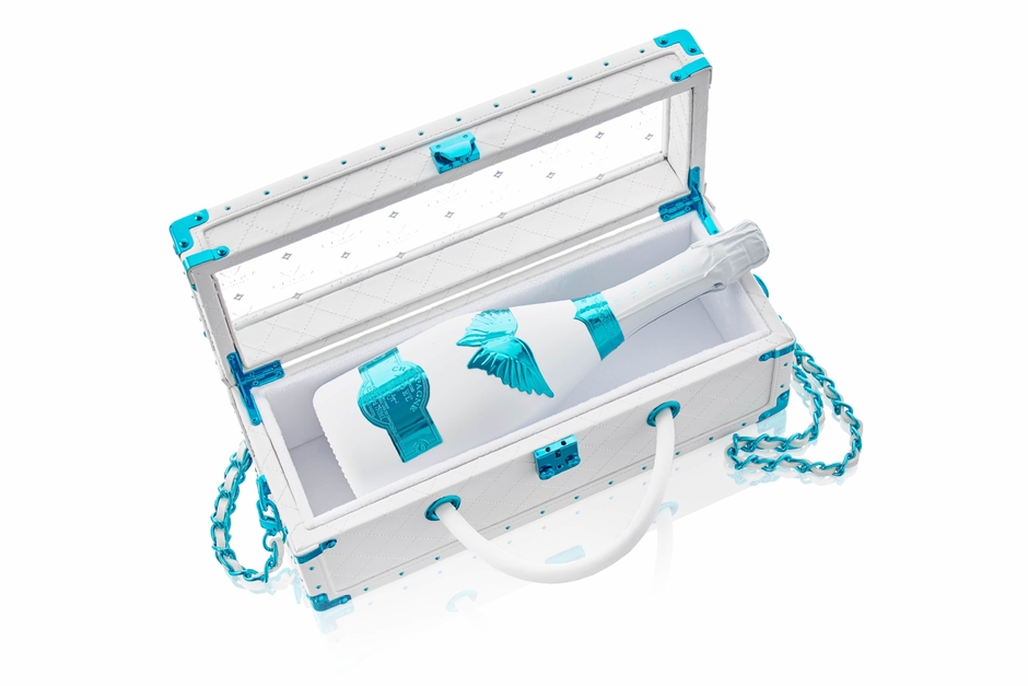 ANGEL CHAMPAGNEの顔とも言える人気商品 NV Brut Rose Whiteをベースとし、艶やかなホワイトデーカラーが圧倒的な存在感で、高級感のあるボトル。バニティタイプのBOX付で、今年からレザータイプとファータイプの2種類で展開。