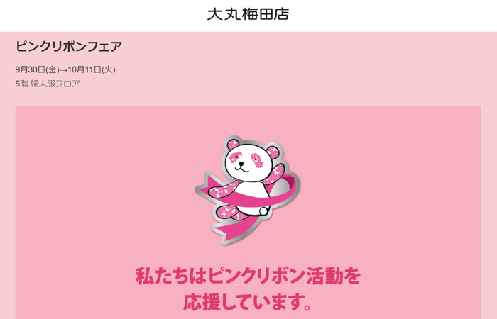 大丸梅田店 5階フロアでは、乳がんに関する知識や選択肢について、触れていただく機会としてピンクリボンフェアと題し、9月30日(金)~10月11日(火)まで開催いたします。