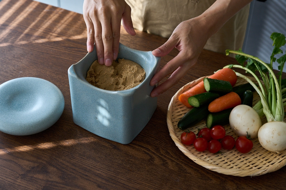中村製作所が持つ技術を、ぬか漬け容器に活かしています。容器の設計は、陶磁器ならではの機能性によって生まれました。この二重構造の容器は、ぬか床の温度を均一に保ち、発酵菌の活動を助けます。