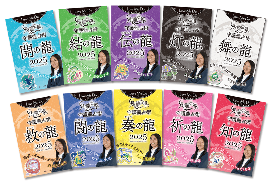 生年月日ごとに割り当てられた【宿命数】と呼ばれる数によって、守護龍のタイプが振り分けられています。まずはあなたの守護龍を調べてみましょう。守護龍ごとに1冊、計10冊の発売。ご自分の守護龍だけでなく、好きな芸能人やご家族、気になるあの人の守護龍を調べてみるのも良いかも。