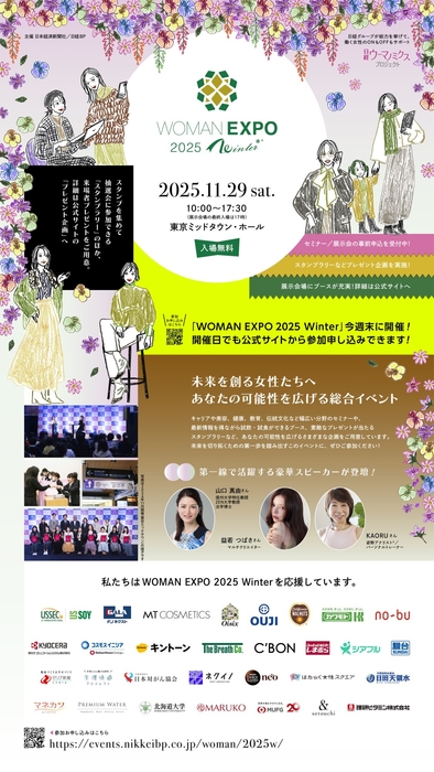 WOMAN EXPOは入場無料ですが、ご来場予定の皆様は公式サイトからの事前申込(セミナーもしくは展示会入場)が必要となります(→ https://events.nikkeibp.co.jp/woman/2025w/ )。新着情報や、各種プログラムの詳細、各展示ブースの出展内容の詳細についても、公式サイトをご覧ください。