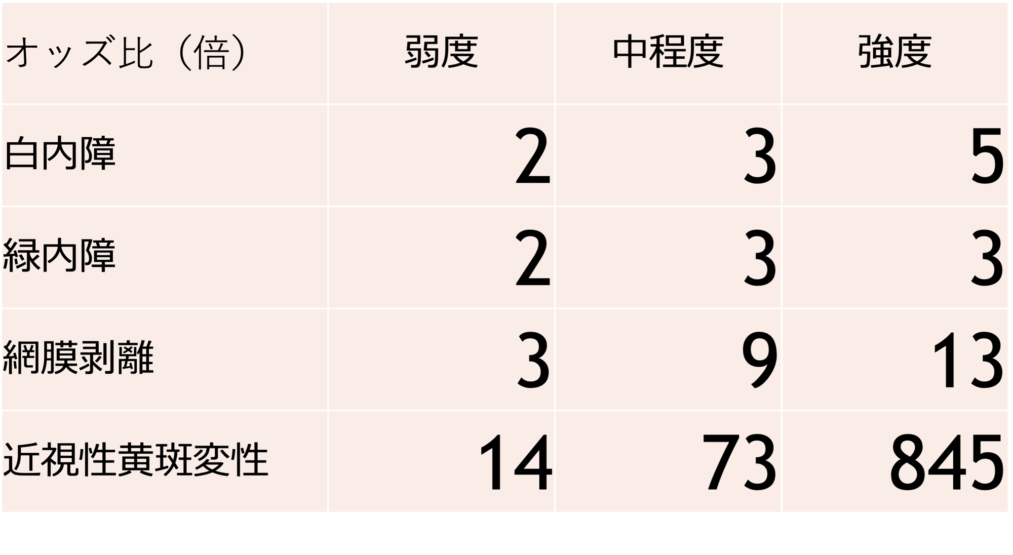 眼が変形することで網膜剥離を始め、緑内障、白内障、黄斑変性などのリスクが増加します。