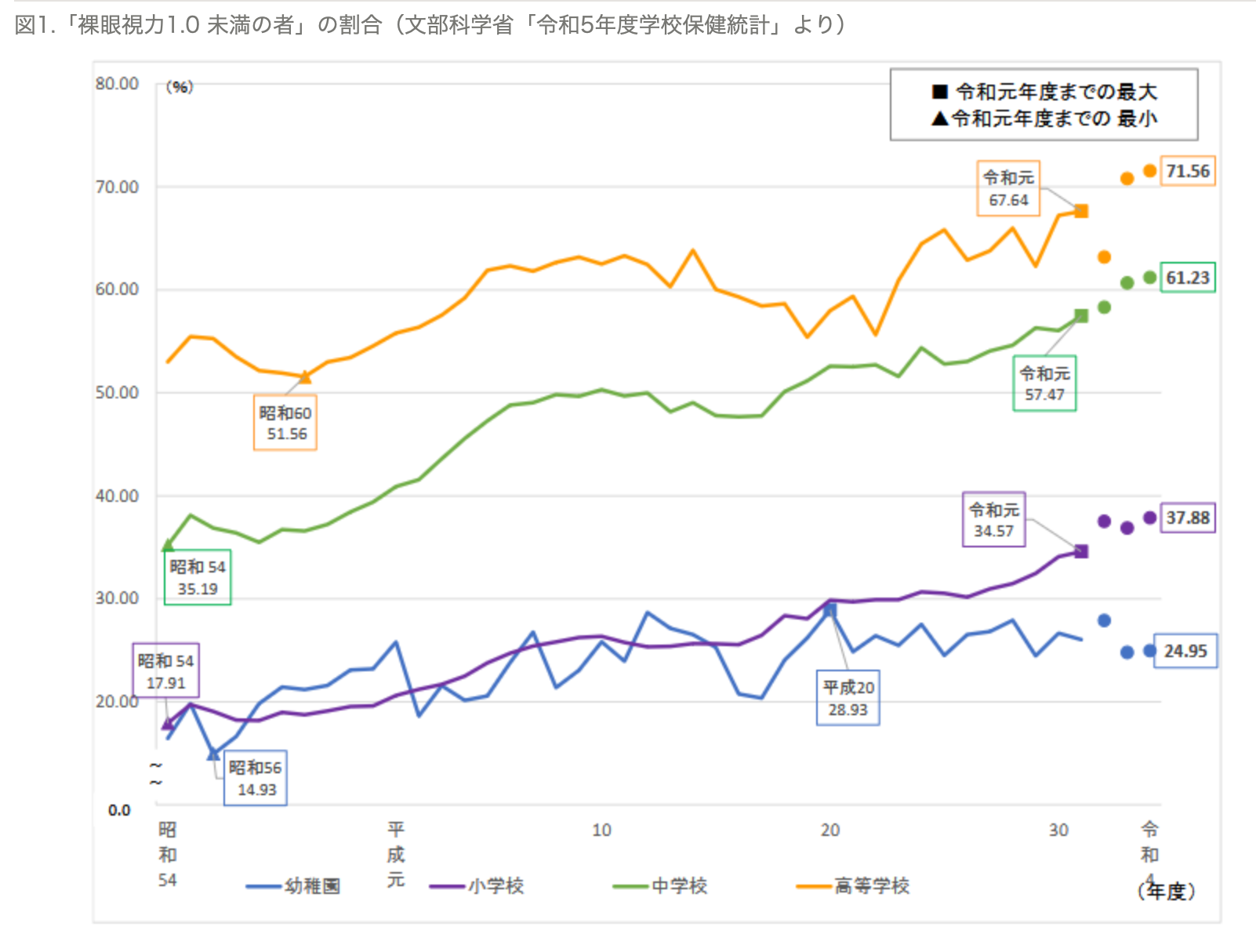高校3年生になると、なんと裸眼視力1.0未満の割合が7割を超えています。