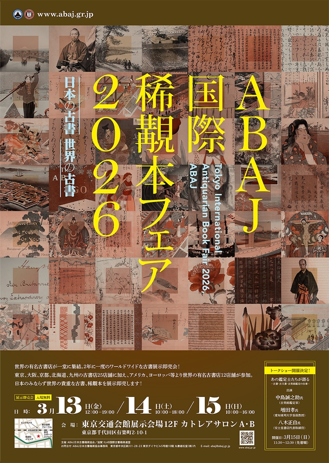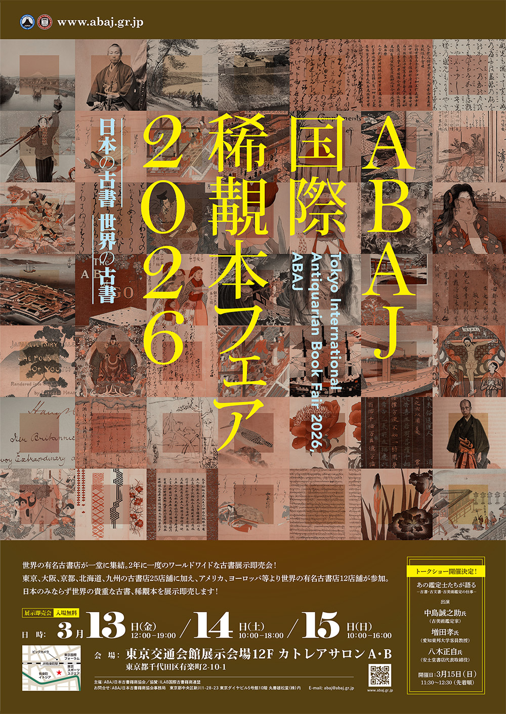 日本古書籍商協会(ABAJ)*は、2026年3月13日(金)~15日(日)の3日間にわたり、日本最大級の古書展「国際稀覯本フェア2026-日本の古書 世界の古書-」を東京交通会館展示会場にて開催します。入場は無料です。