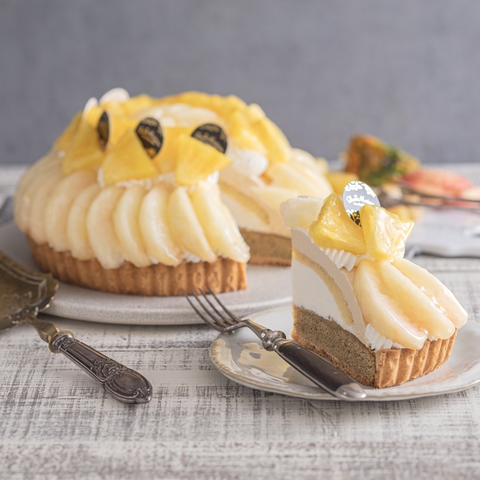 商品詳細:しっとりと焼き上げたケークタルトに華やかなジャスミンが香るミルクティークリームとフルーティーなパインジャムを重ね、甘く爽やかな酸味のパイナップルとみずみずしい白桃を飾りました。