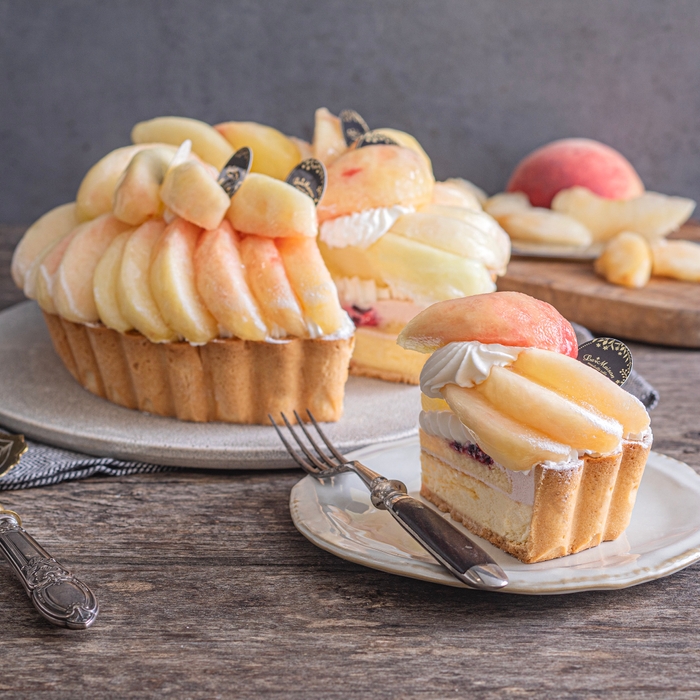 商品詳細:香ばしいアーモンドタルトになめらかなディプロマットクリームを重ね、みずみずしい桃を包み込みました。糖度12度以上の甘さの特秀品にあたる最高糖度の桃「大糖領/一桃匠」を贅沢に使用したタルトです。