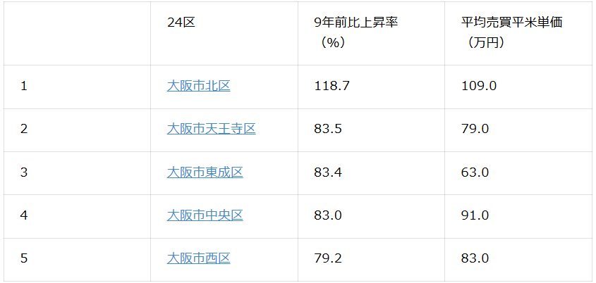 大阪市24区における9年前との上昇率をランキング形式で紹介します。