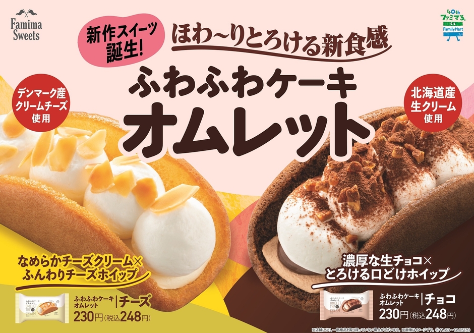 このたびは、「40のいいこと!?」の5つのキーワードの1つである「もっと美味しく」の一環として、こだわりのふわふわオムレット生地にくちどけの良いホイップクリームが織りなす、かつてない新食感スイーツ「ふわふわケーキオムレット チーズ」「ふわふわケーキオムレット チョコ」各230円(税込248円)を2021年11月23日(火)から、全国のファミリーマート約16,600店にて発売いたします。