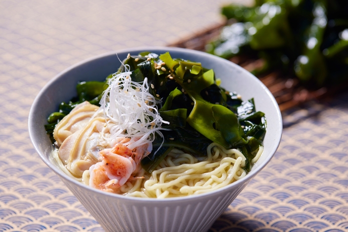港に戻り、自分で収穫したわかめと、港に用意された麺やスープ、具材を使用してわかめラーメンをつくります。これは、獲った時に茶色だったわかめが、お湯で茹でると緑色になる過程を見ることができる体験です。茹でたわかめは食べやすい大きさにカットし、ラーメンの上に好みの量をトッピングします。日常生活でも食べる機会のあるわかめラーメンだからこそ、家に帰ってからもプログラムで学んだことを思い出すきっかけになります。