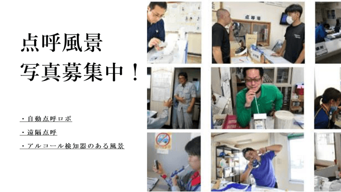 自動点呼ロボ(当社のe点呼セルフ typeロボケビー)、遠隔点呼機器(当社のe点呼セルフや Tenko-PRO2)、アルコール検知器(当社製品であれば機種問わず)が映っている写真を募集いたします。