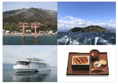 びわ湖北部の新しい旅の提案として、初めて実施する本企画は、長浜港を起点とする半日観光コースです。北びわ湖をぐるっと一周しながら、まずは、古くより神様が棲む島といわれる“竹生島”へ。島内では自由散策とあわせて、日本三弁才天を祀る“宝厳寺”や“都久夫須麻神社”にご参拝いただけます。竹生島を出港した後は、対岸の今津港へ寄港。うなぎの名店“西友”での昼食をお楽しみいただけます。その後、近江最古の大社である“白鬚神社”へ船で向かい、湖上に浮かぶ大鳥居側より湖上参拝したのち、再び長浜港へと戻ります。
