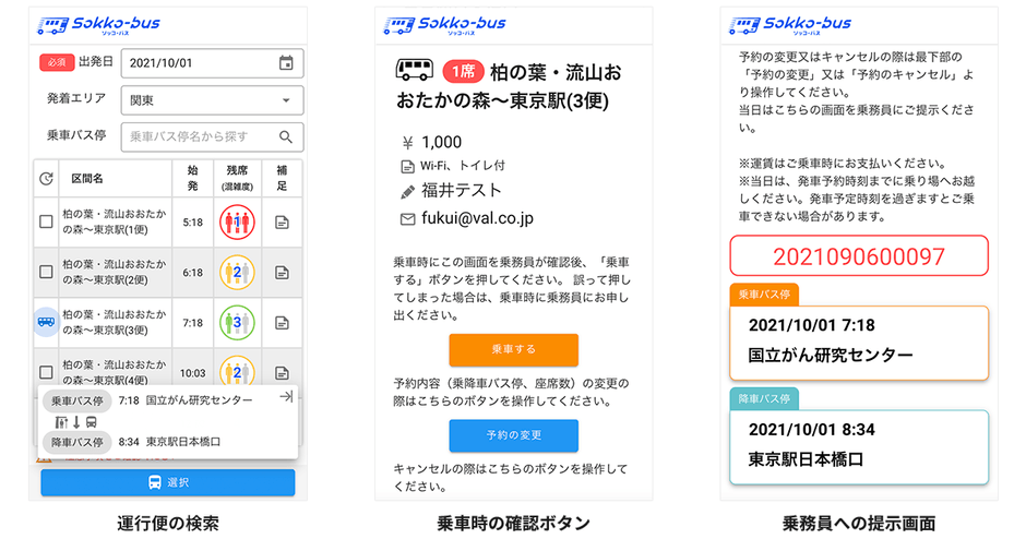 利用者はスマートフォンやパソコンのウェブブラウザから運行便の検索・予約を行い、乗車時にはスマートフォンで予約画面を提示することで、乗務員による乗車確認が行えます。
