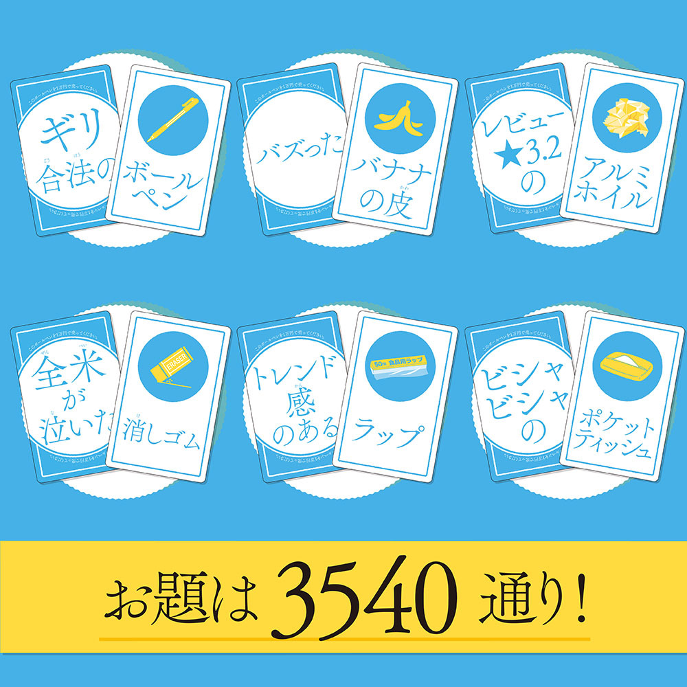 「全米が泣いた 消しゴム」、「ビシャビシャの ポケットティッシュ」、「バズった バナナの皮」、 「トレンド感のある ラップ」など、なんとも手強いお題は3,540通り。