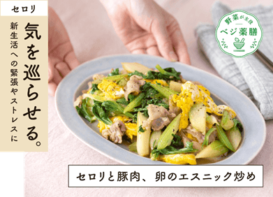 セロリの豊かな香りには、ストレスを和らげるリラックス効果があり、まるで“食べるアロマ”のような野菜です。新生活に向けて何かと落ち着かず、気が高ぶりやすいこの時期の強い味方。体の熱を冷ます作用もあり、ストレスからくるイライラやほてりなど、体に熱がこもっていると感じたら「セロリと豚肉、卵のエスニック炒め」を食べて心身共にリラックスしましょう。