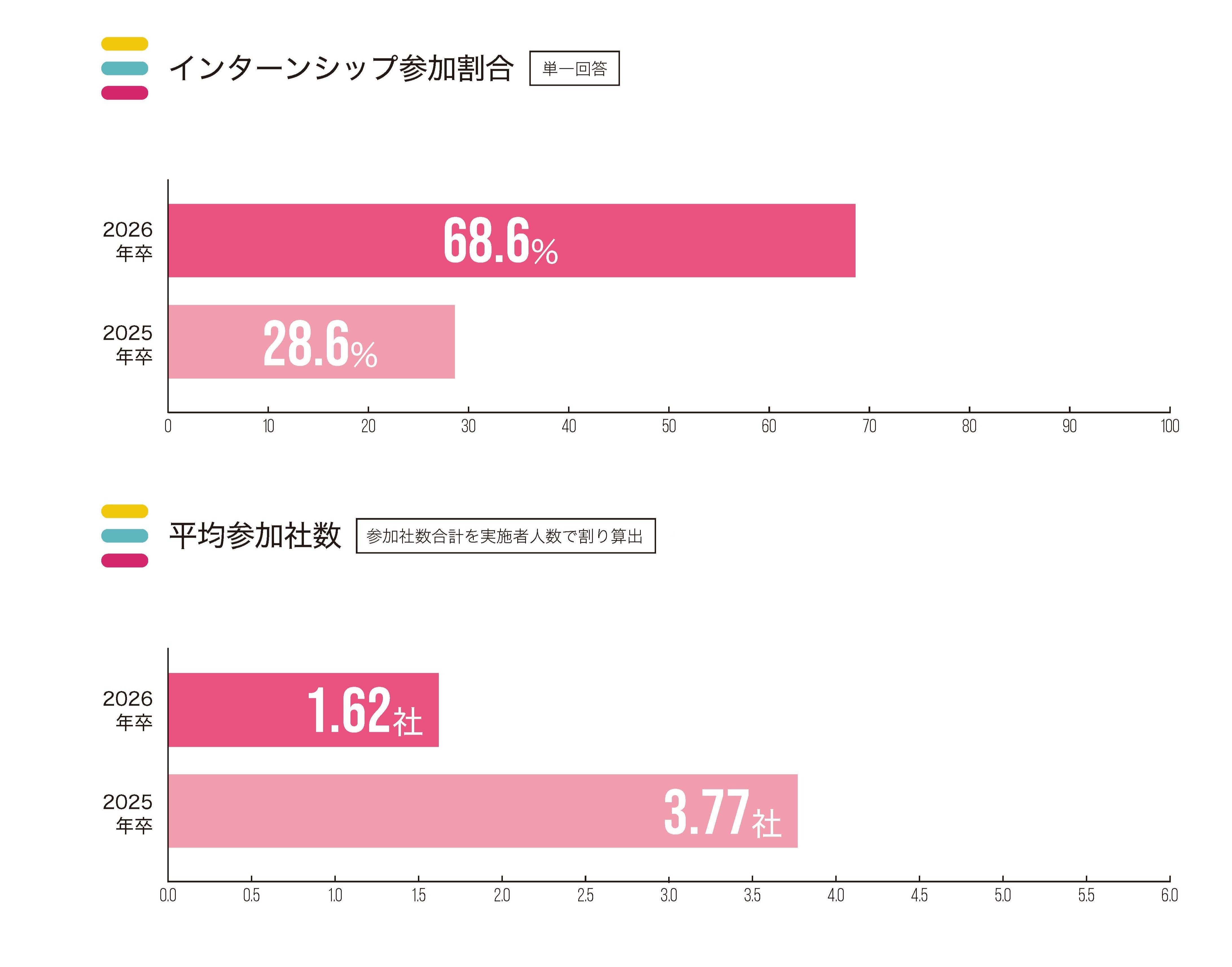 「インターンシップ参加割合」は、25卒の28.6%から26卒では68.6%に増加する結果となりました。