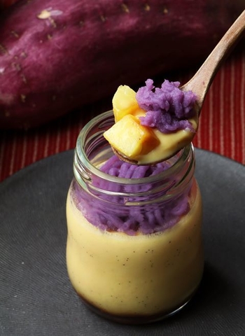 ペースト状にしたおいもをプリンに練りこみプリン全体をお芋味にするだけでなく、彩りと一口目の香りを引き出すため、プリンの上に紫芋のペーストを、そしてプリンの中にはカラメル風味の焼き芋を忍ばせることで、お芋の香りとホクホク感、プリンのなめらかさとバニラの香りを楽しめるプリンになっています。