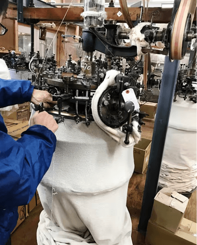 現在の編み機に比べると生産効率は約180分の1となり、ドレステリアの吊裏毛スウェットシリーズの商品を生産するには1台あたり1日7着分の生産がやっとです。