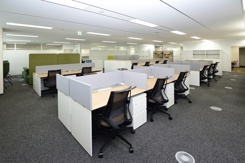 オフィスの専有部分は、業務拡大に伴う社員数の増加に対応して、従前の1.5倍以上の広さに拡張しました。各個人にゆとりのある業務スペースを確保しているのみでなく、業務内容の特性に合わせて、部署独自の部屋や作業用の個室も設けています。さらに、独立した休憩室や簡易的なミーティングにも対応可能なリラックススペースを設けることで、社員のニーズに合わせ働きやすさを向上できるレイアウトにいたしました。