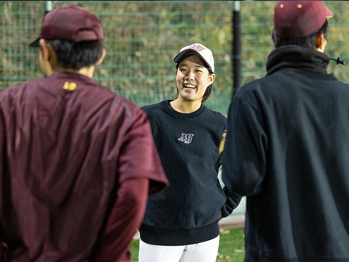 その一人が、女子学生コーチとして活躍する山内萌衣さん。高校時代に強豪女子野球部でプレーした経験を生かし、現在は部員たちの練習や試合をサポートしています。