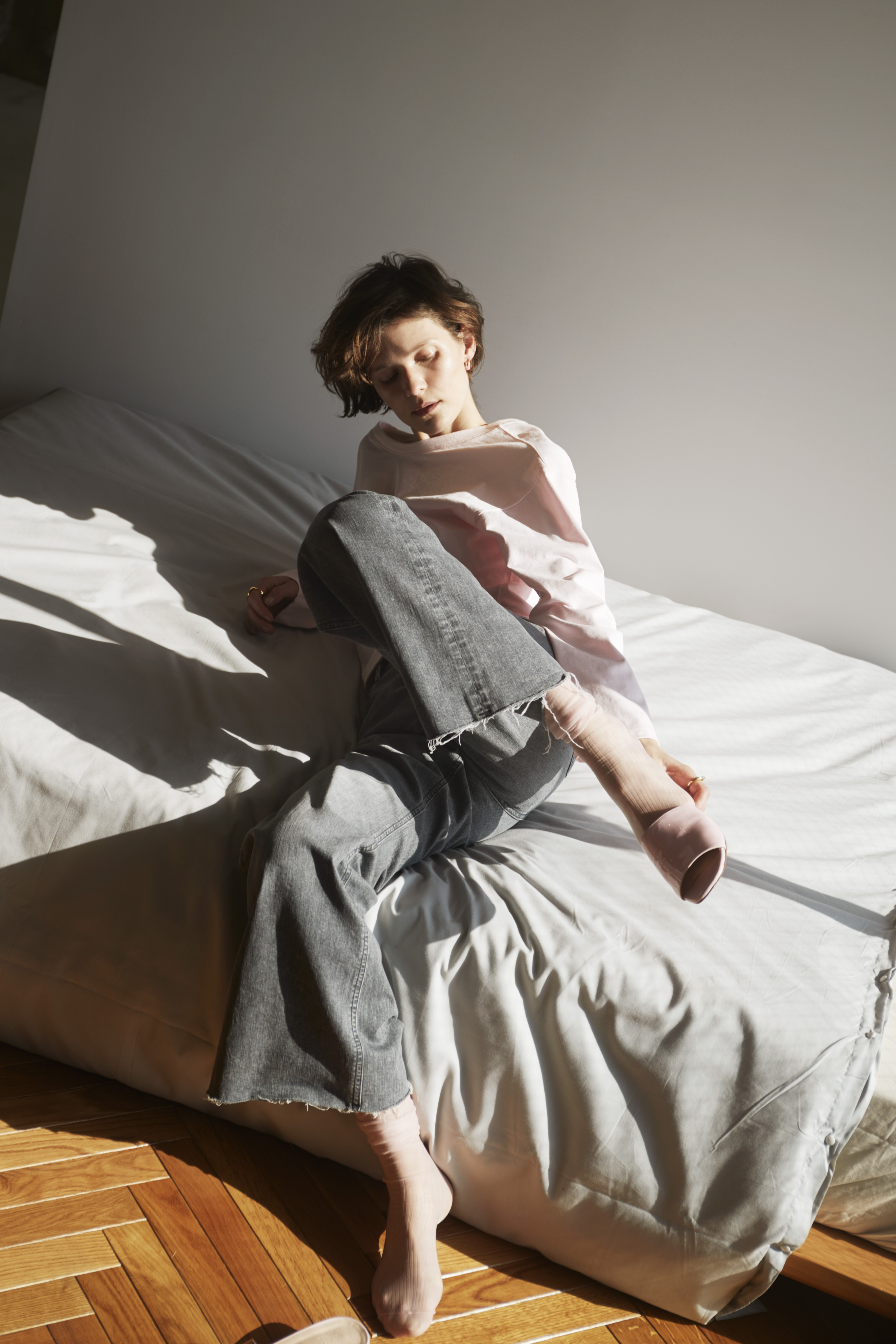 マニッシュなグレーデニムの雰囲気が和らぐシアーピンクのソックスに、足元はグレーのミュールでさりげなく洒落たスタイルに。