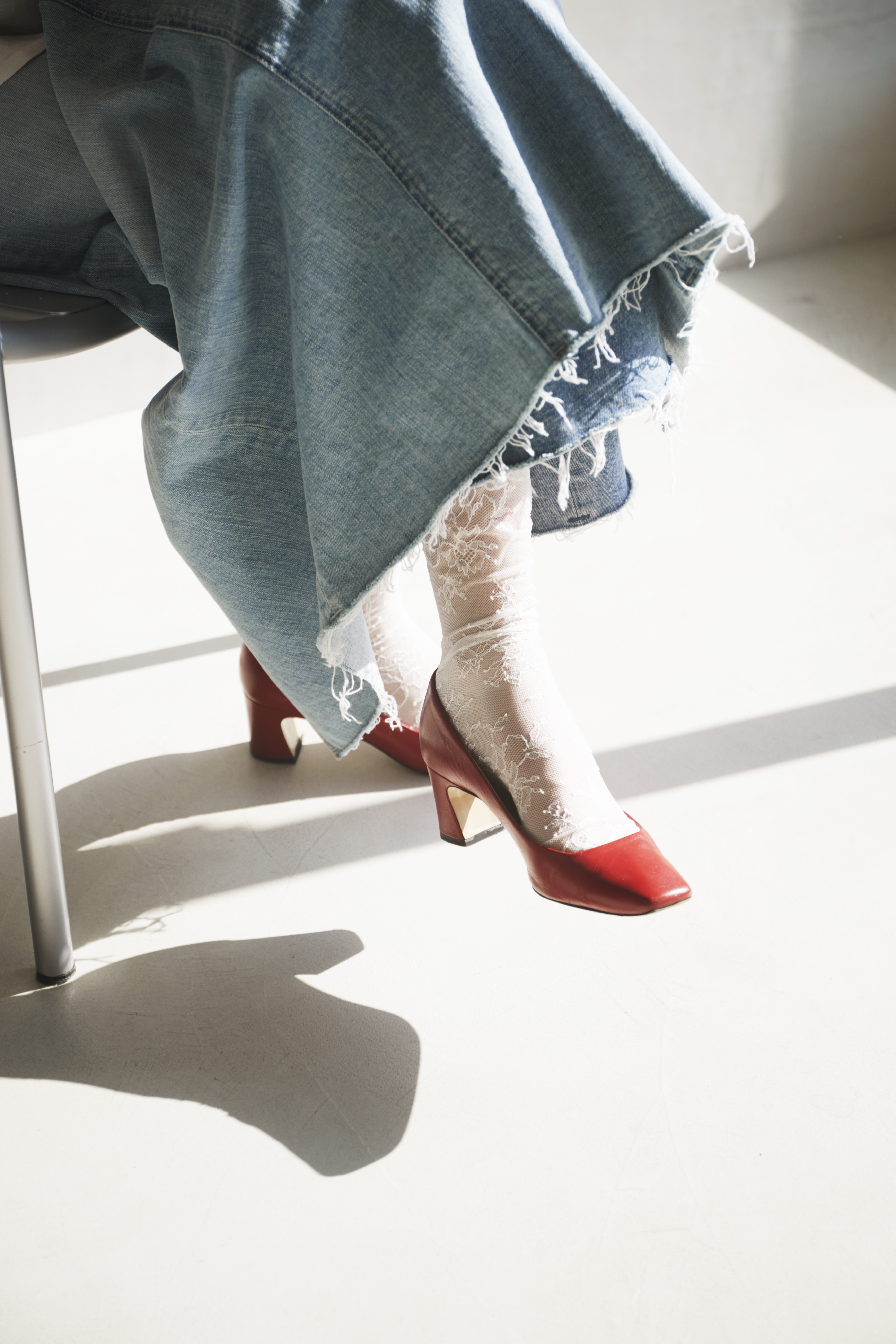 デニムスカートのボリューム感と、少しレトロな赤いヒールシューズとの隙間を華やかに繋ぎながら足元の流れを作ってくれるレースソックスは、シアーで女らしい表情も相まって、デニムにまた新鮮な雰囲気をもたらしてくれます。