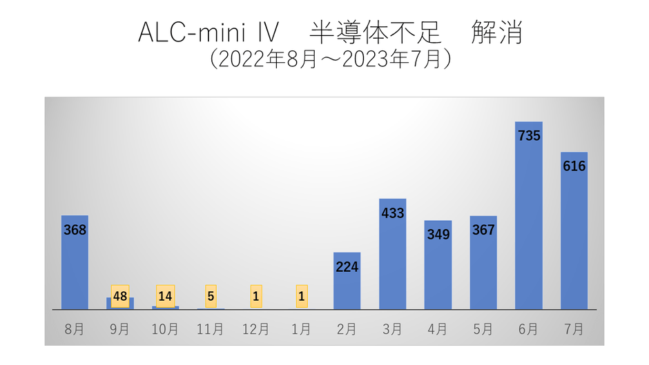 この1年、電⼦機器製造業界では半導体部品の不⾜問題があり、本機器 ALC-miniⅣ ICも⼀時期は製品出荷がゼロに近い⽉がありました。