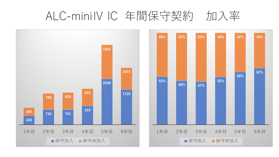 2023年2⽉頃から出荷が再開されましたが、部品不⾜の影響を受け、結果、ALC-miniⅣの6年⽬の実績は前年⽐減となりました。⼀⽅で累計では、発売から順調に推移し、6年⽬を迎え累計出荷数は1万台を超えました。