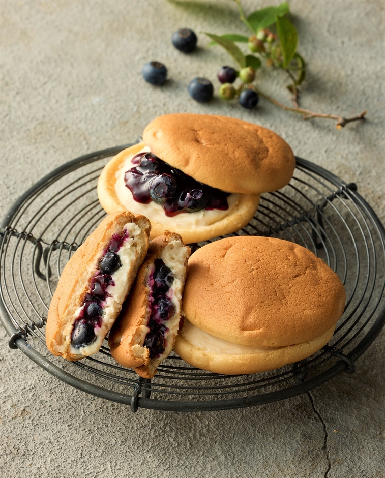 クリームチーズと生ブルーベリーをサンドしたふわふわのチーズスフレ。