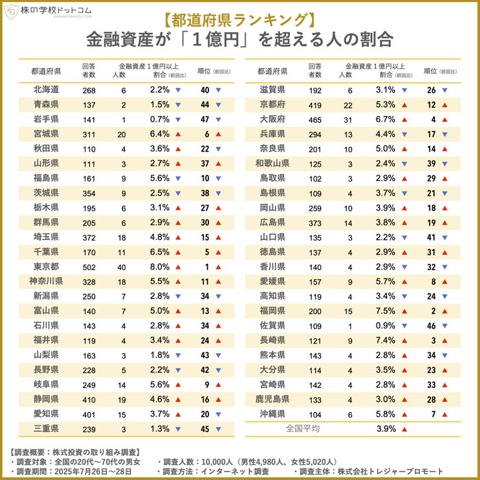 2位以降は、福岡県の7.5%、長崎県の7.4%、大阪府の6.7%、千葉県の6.5%が上位に入りました。前回調査(2024年7月)と比較すると、金融資産1億円以上の人の割合は全国平均では0.9ポイント増え、30の都府県でも前回を上回りました。