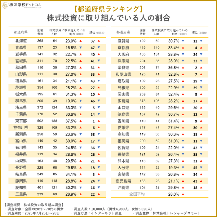 インターネットのアンケート調査を活用して、全国の1万人(20〜70代)に対して「あなたは株式投資に取り組んでいますか?」という質問をしたところ、「はい」と回答した人は、47都道府県の平均は28.0%でした(各都道府県の数値を合計し47で割って算出。以下同様)。