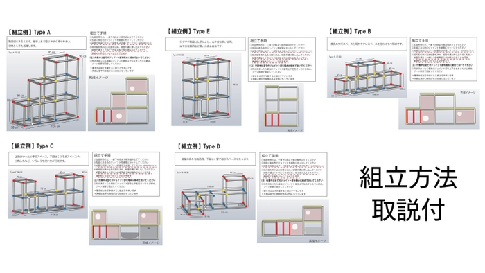 全5パターンの組立方法の説明書付きで、お部屋に合わせて自由なアレンジも可能です。