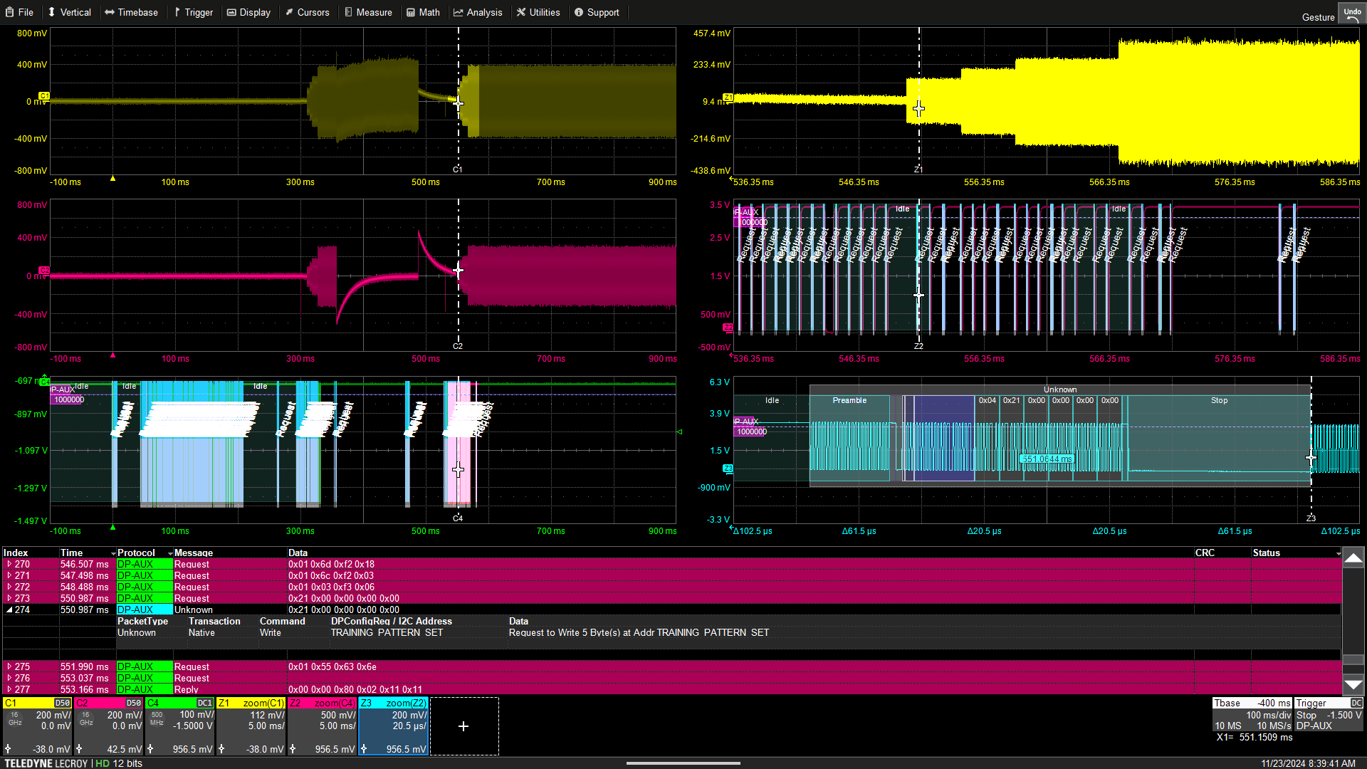 AUXチャネルやUSB-Cパワーデリバリ メッセージをトリガ・デコードし、SourceとSinkのリンクネゴシエーションを効率的にデバッグ。