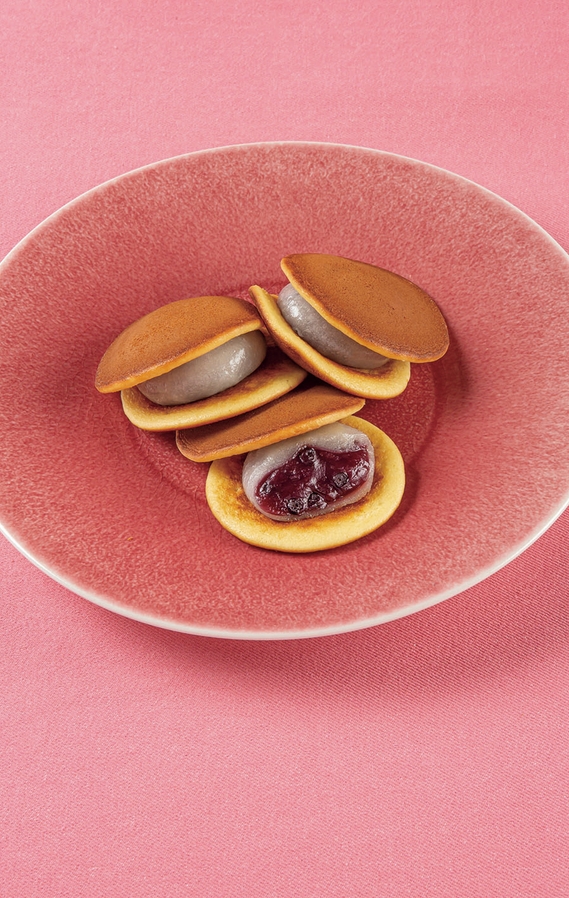 ラズベリー、ストロベリー、ブルーベリー、クランベリーの4種のベリーを使った甘酸っぱいベリー餡をもちとろ食感の大福生地で包み、プレーン生地のどら皮ではさみました。